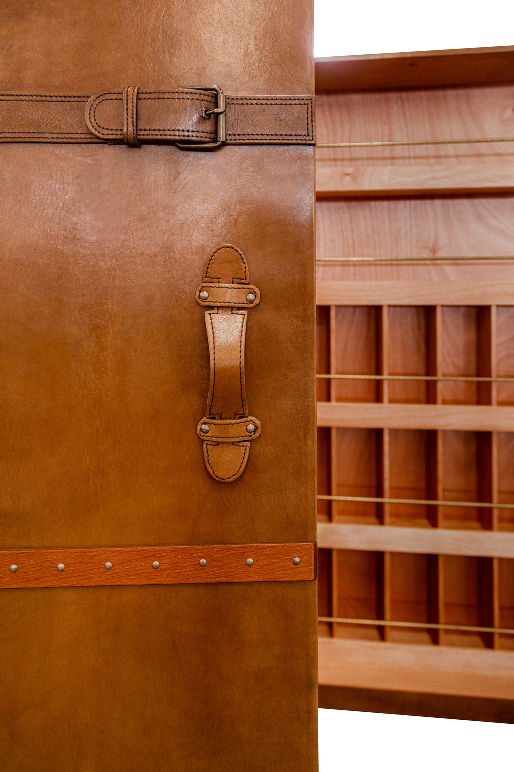 Al abrirse, revela un interior cuidadosamente organizado que combina funcionalidad y artesanía: compartimentos para botellas, espacios para cristalería, estantes y cajones que permiten mantener cada elemento en su lugar. Cada detalle está pensado para crear una experiencia de bar completa, mientras conserva la sensación de descubrir el contenido de una gran maleta de viaje.